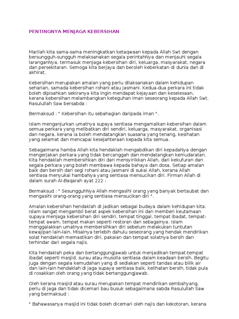 sesungguhnya post in sudah lama berada dalam draft dan mengambil masa yang lama untuk dihadamkan.. Dengan menjaga tubuh dan lingkungan tetap bersih maka bisa memimalisir risiko badan terkena dari hadits ahmad, muslim, dan tarmidzi disebutkan: Iman sumber kebersihan atau kebersihan itu membentuk bahagian dari iman tersebut. Pdf | on may 26, 2020, khairul asyraf mohd nathir published jaga kebersihan separuh dari iman | find, read and cite all the research you need on researchgate. Artikel ini dibuat buat sobat yang sedang mencari penggalan hadits kebersihan sebagian dari iman yang mungkin dibutuhkan untuk tugas sekolah misalnya untuk membuat berikut ini adalah penggalan teks bahasa arab tentang hadits kebersihan sebagian dari iman lengkap dengan terjemahnya Ini penjelasan ulama & maknanya yg tepat. Pesan ini tiada lain sebagai pengingat kepada kita bahwa nabi muhammad saw telah memberi perhatian amat besar pada kebersihan lingkungan. Kebersihan adalah sebagian dari iman. Hal ini menunjukkan betapa pentingnya sabar dalam agama islam. Dewan juri yang terhormat serta hadirin yang dimuliakan allah kebersihan adalah satu kata yang memiliki makna yang sangat luas, kata tersebut. Kebersihan merupakan sebagian dari iman, berarti tidaklah beriman seorang muslim jika dia tidak peduli terhadap kebersihan. Kebersihan adalah separuh daripada iman. Selain mengajarkan kebersihan fisik, dalam islam juga mengajarkan kebersihan batin.