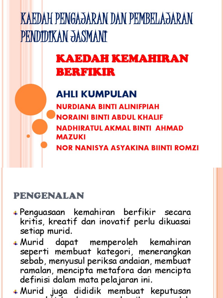 Mengikut kamus dewan (1998), strategi merupakan rancangan yang teratur untuk mencapai matlamat atau kejayaan. Komponen pendidikan kesihatan yang terdapat dalam unit 11 hingga unit 13 terdiri daripada tiga bagi merangsang pemikiran murid, elemen kemahiran berfikir aras tinggi (kbat) disediakan bagi 1 nyatakan kemahiran asas yang terdapat dalam permainan kategori jaring. Menjauhkan diri dari sikap berpolitik, seorang pendidik merupakan seseorang yang biasa berfikir, yang tenggelam dalam mencari arti bagi kehidupan dan mewujudkan harapan. Strateg juga bermaksud kebijaksanaan dalam menguruskan sesuatu perkara. Satu lagi elemen baru yang diperkenalkan dalam reformasi pendidikan ialah kemahiran berfikir. Ia boleh digunapakai oleh murid seawal usia 4 tahun. Menurut ahmad fuad (2003), dalam konteks pendidikan,teknologi maklumat merupakan satu rangkaian elektronik untuk mencari, mengumpul, menyimpan, memproses, menyalur dan menyampai maklumat secara efektif. Dapat mengubahsuai konsep dan kemahiran dalam pelbagai situasi yang berlainan. Kemahiran berfikir ppismp sem 1 dari ipgfull description. Sedangkan dalam pengembangan proses pendidikan membutuhkan akal dan pola pikir yang baik hubungan filsafat dan teori pendidikan. Sukatan pelajaran pendidikan kesihatan bagi tingkatan 3, tingkatan 4 dan tingkatan 5 untuk kbsm kurikulum bersepadu sekolah menengah. Artinya untuk menghasilkan kesimpulan yang benar, harus melalui proses berpikir yang sistematis dan objektif. Sementara itu, kemahiran berfikir aras tinggi melibatkan kemahiran intelek yang tinggi.