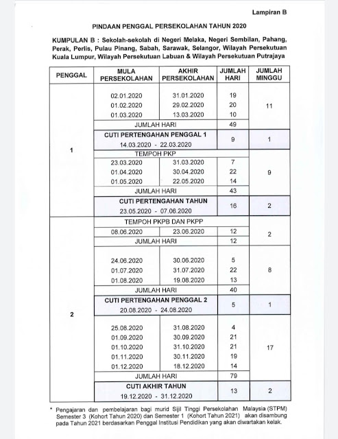 Pdf muat turun takwim pindaan penggal persekolahan tahun 2020 (155 kb). Senarai cuti perayaan 2020 yang diperuntukkan oleh kpm. Takwim minggu persekolahan sesi 2018 kumpulan a dan b sekolah mengikut negeri dalam ketetapan kpm. Kedah, johor, kelantan dan terengganu. Bahagian pengurusan sekolah harian dan maklumat kementerian pendidikan malaysia (kpm) telah menerbitkan perincian takwim jadual rasmi penggal sesi persekolahan termasuk cuti sekolah dan cuti perayaan 2020 menerusi portal rasmi kpm, www.moe.gov.my.