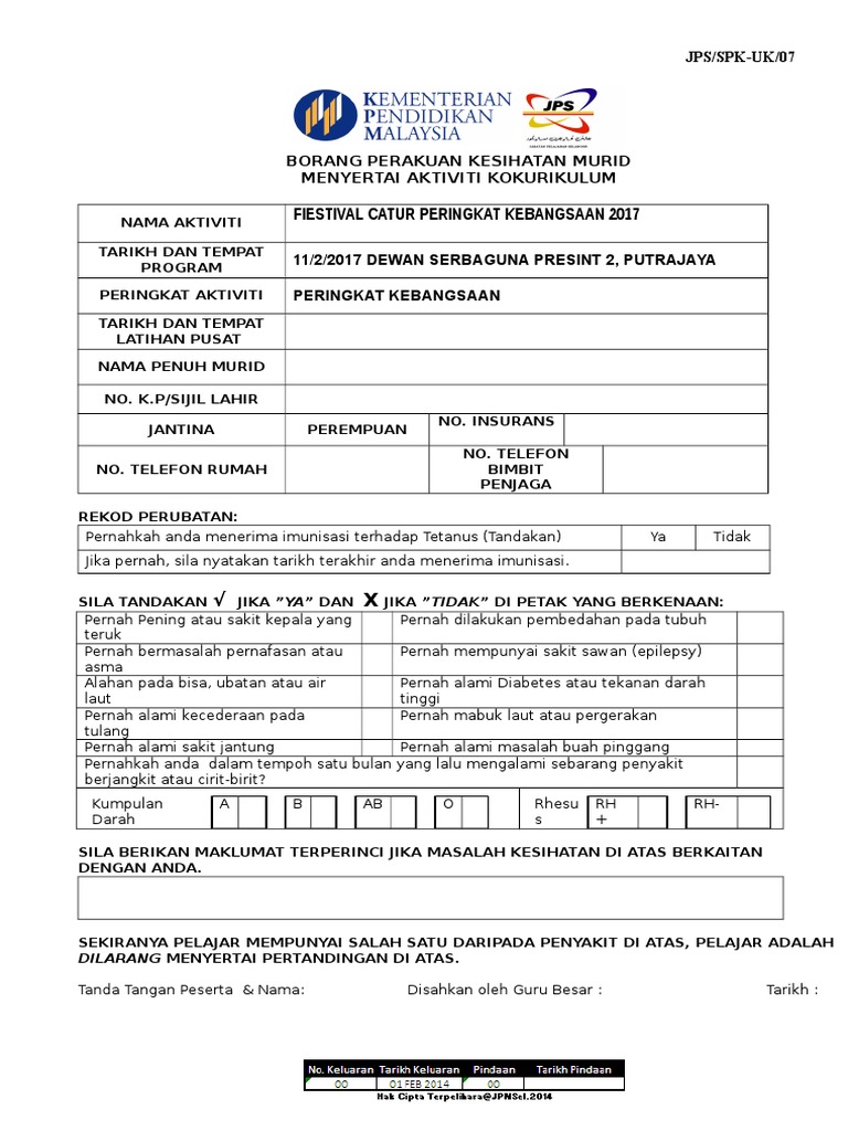 Borang perakuan kesihatan murid sebelum menyertai aktiviti kokurikulum peringkat kebangsaan nama aktiviti. Borang perakuan kesihatan murid sebelum menyertai aktiviti kokurikulum / luar nama aktiviti tempat aktiviti peringkat aktiviti tarikh mula tarikh akhir nama penuh murid no. Borang kebenaran skim potongan gaji kakitangan awam tabung kwapm ( pdf, 149 kb ) (925 muat turun) 19 feb 2019. Lengkap / tidak lengkap 3. Induk surat kebenaran ibubapa perakuan kesihatan murid 2013.