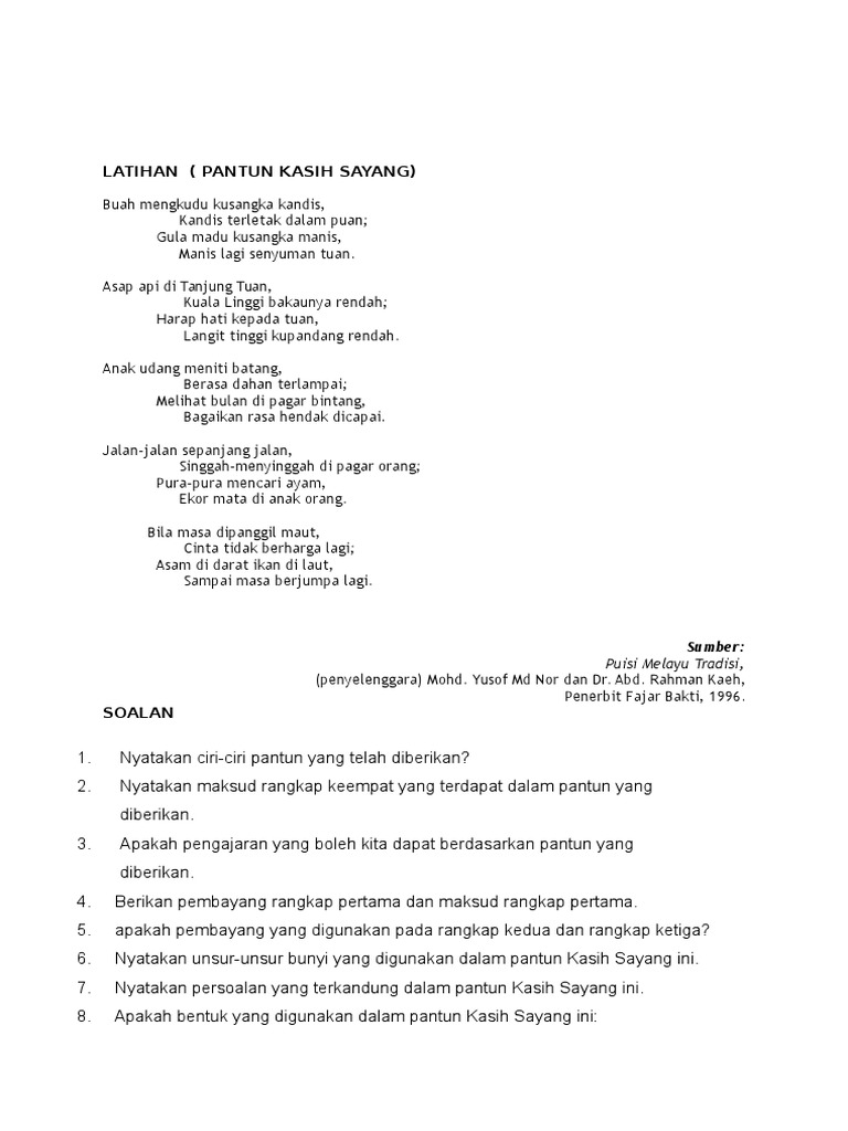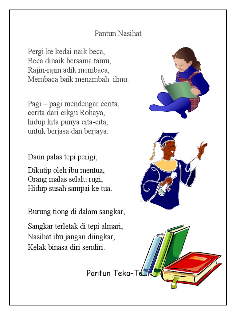 Pantun Nasihat Sekolah Rendah from library.mod.gov.my Di zaman dahulu, pantun diungkapkan dengan lisan terutama oleh masyarakat melayu di. Orang mengail di teluk bulang, apalah umpannya si kulit duku; Orang jawa mencari benang, mencari benang di atas bukit; Jika ingin mendulang cadas jangan lupa palu baja jika murid tumbuh cerdas guru pun ikut bahagia. Pantun nasehat cukup banyak digunakan dan dibacakan. Contoh pantun nasihat dengan tema menjaga kesehatan. Pantun nasihat berguna untuk memberi ajaran baik dan teguran. Jadi nasehat itu, tak hanya dari ceramah, pidato dan lain sebagainya.